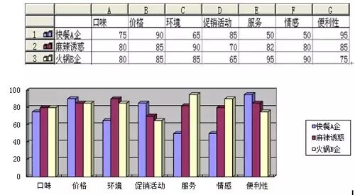 图2是第三方权威机构的调查数据。如图所示,利用七个维度的概念能够直观的看到三家企业的得分及所处的位置。例如在口味维度上,三家餐饮企业并驾齐驱;在价格维度上,快餐A企占有优势,其它维度可以以此类推。