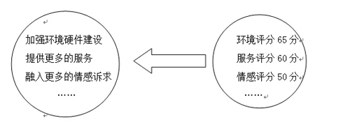 如果将企业竞争力比喻成一只木桶,七个维度可想象组成木桶的7块挡板。那么七个维度中的每一块都有可能制约企业核心竞争力的高度。如何能让企业核心竞争力的大木桶高大而坚固,这就需要从每个维度去仔细的分析考量。以快餐A企为例,图中经过七个维度的评分,可以很直观的看到快餐A企的环境、服务、情感相对其他两家企业较低,那么快餐A企就可以做出相应的改善计划,来减少短板可能带来的竞争力低下问题(如图3所示)。