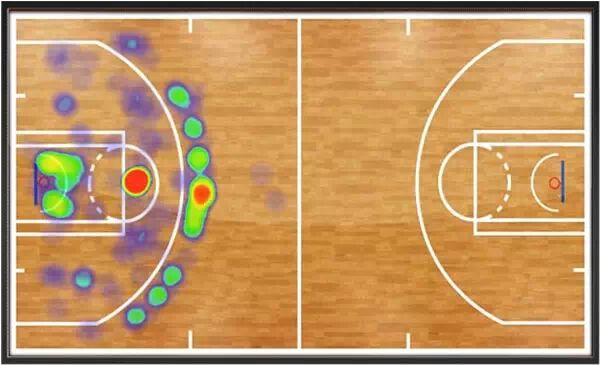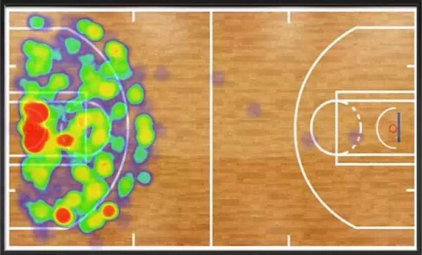 杜兰特的防守热区,明显叫投射范围更广,这说明杜兰特当年在防守端的精力和投入在一定程度上掩盖了他的得分欲望和天赋(Durant’s defending Hotspots area isobviously wider than the shooting’s, which indicates incertain extent that the energy input on the defense had covered part of hisdesire and talent of scoring.)