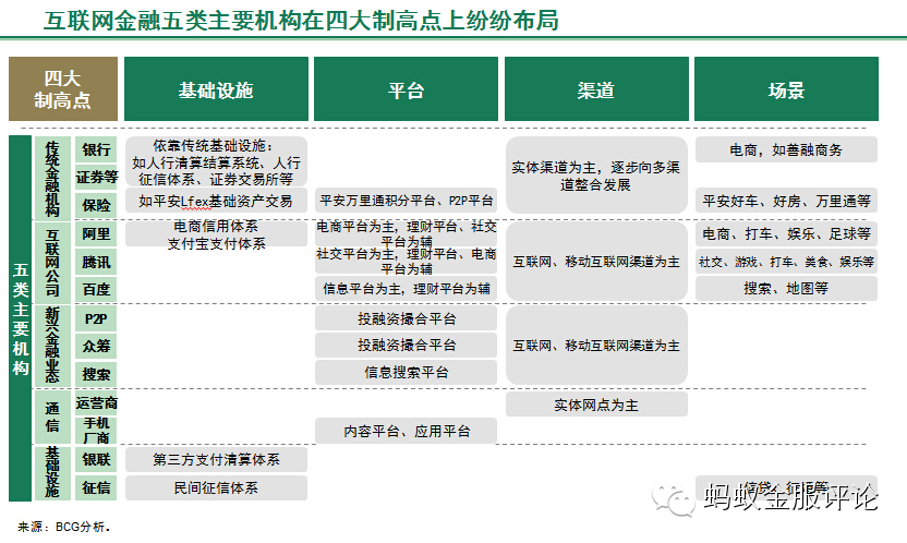 无论是哪种思维,其目的都是把握互联网金融竞合关系的制高点,并据此进行布局。事实上,这两种思维尽管看似不同,但其关注的核心制高点仍有许多相似之处。