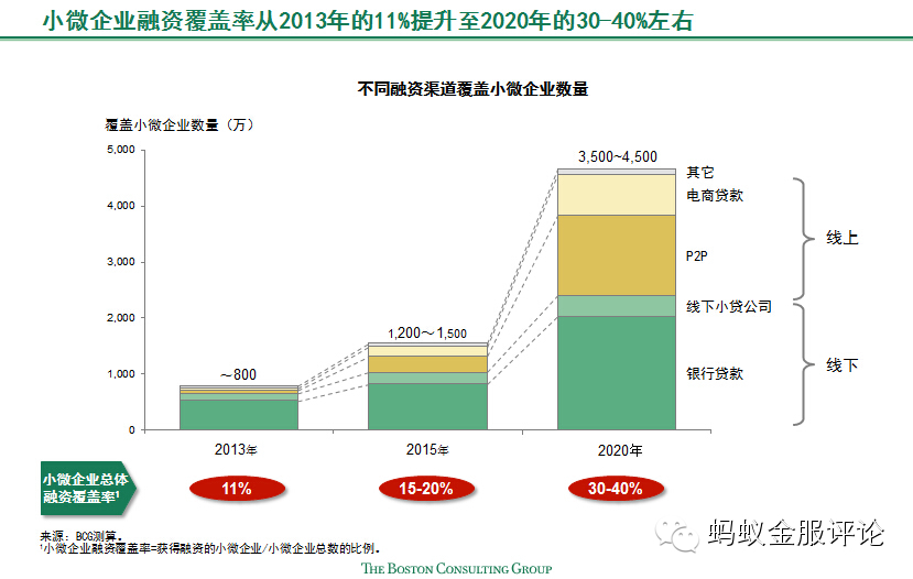 例如,未来随着我国征信体系的完善,P2P、电商网络贷款等新的业态将迎来极大发展。更重要的是,其数据分析的模式和工具也可以为传统金融机构所借鉴,帮助传统金融机构真正实现小微业务的下沉。根据BCG测算,在P2P、电商网贷等新兴融资渠道的驱动下,我国小微企业融资覆盖率有望从2013年的11%提升至2020年的30-40%,这意味着超过3000万家目前未被覆盖的小微企业和个体工商户的融资需求有望在未来几年获得满足。