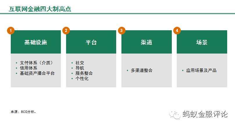 总结来看,互联网金融一共有四个制高点:基础设施、平台、渠道、场景。其中,基础设施是最有可能产生颠覆性创新的领域;场景是金融“生活化”以及“以客户为中心”的核心体现;平台是互联网行业平台模式在金融领域的延续和创新;渠道则是互联网时代对金融机构传统核心资产的重新审视,也是互联网企业线上线下整合的重要阵地。