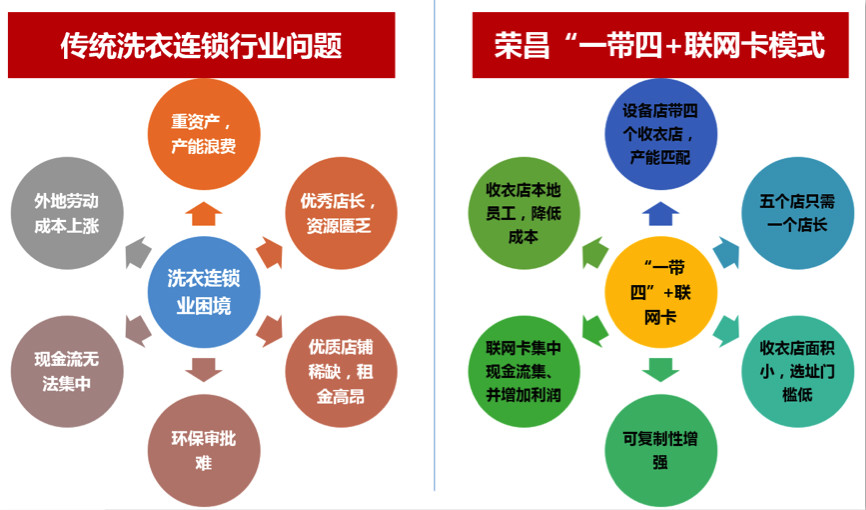 “一带四”,就是“四店收衣一店洗”,这意味着只需原来1/5的设备和店长,但收衣点控制权在荣昌手里。同时,荣昌通过推广、配售洗衣联网卡将全国连锁店信息系统联网。两个措施下来,荣昌仍然是一家轻公司,但是对于整个连锁体系的控制力却大大增加了。