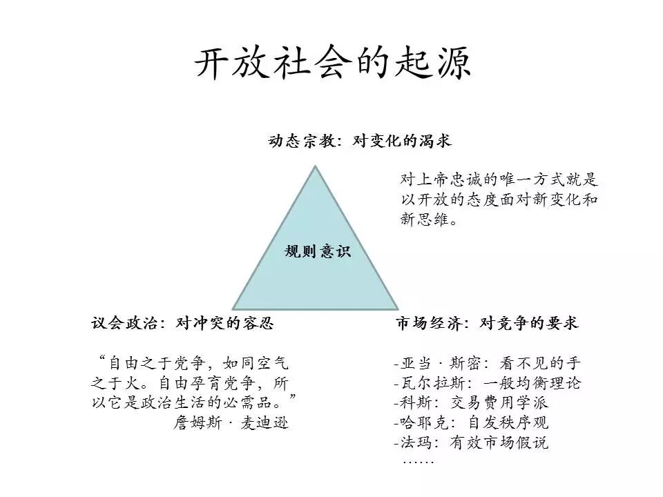 最重要的是上面这个角所谓的“动态宗教”,如果你不喜欢宗教这个词,你可以说动态意识形态,改掉这个词。这个是开放社会的最本质的特征,它指的是什么呢?1932年,法国有个哲学家叫柏格森——你看我引用的全部是法国的学者,因为法国人这方面看得最清楚——他发现,有一种社会是能够满足人类内在的对变化、对新奇的渴望的,这种社会就叫开放社会。后来波普尔写过一本著名的书叫《开放社会及其敌人》,而新制度主义经济学派的创始人道格拉斯·诺斯也在这个问题上做了很多非常有见地的研究。