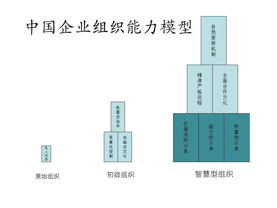 这种互联网时代,组织就有些特殊的地方。大家都知道我在中欧讲课讲了将近十年,讲这个智慧型组织。总的思想很简单,就是而今你要给年轻人发三份薪水,人家才肯给你干活。第一份是财富的薪水;第二份是能力的薪水;第三份是价值观的薪水。你必须有三份薪水,人家才会给你干活。这是智慧型组织,之前的是初级组织,再之前的是原始组织,它们都达不到这种功效。原始组织模拟的组织对象是家庭,初级组织模拟的对象是军队,而智慧型组织模拟的对象是什么呢?我实话告诉大家,中国几千年历史没有这样的东西,唯一有点像的,在当代历史、现代历史中的是什么?是共产党,原来中国历史没有这种东西。所以,原始组织把人当马仔看,初级组织把人当机器、当易拉罐看,智慧型组织把人当人看,它是回到人的根本。