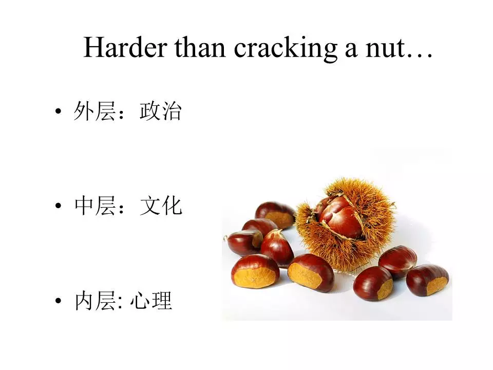 为什么中国人那么不容易发展自我意识,因为我们中国人特殊的这种生存背景。大家知道,自我意识是一种很高级的东西。大猩猩去照镜子,你在它鼻子上点一点白色,大猩猩不会摸自己的鼻子,它去摸哪儿?它去摸那镜子,它总觉得是别人的白鼻子,总觉得是别人的错,它不会觉得是自己的错。中国因为外层、中层、内层的原因,我们要发展self awareness(自我觉察)极艰难。