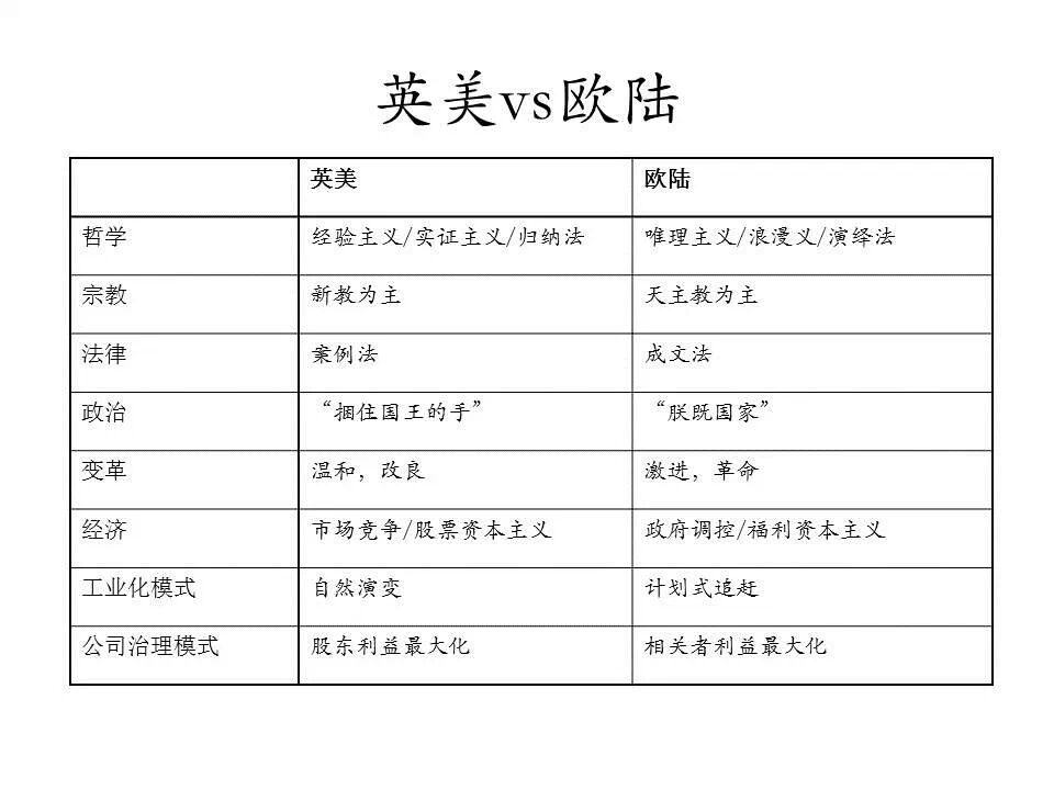 但是很多人不服气呀,不仅我们中国人憋着劲要搞中国模式,俄罗斯也要搞俄罗斯模式,德国也要搞德国模式,但最有资格搞不同模式的是谁?是法国。法国当时有一个著名的人物拉博·圣艾蒂安就呼吁,“啊,法兰西!你不要去学习榜样,你要去树立榜样!”所以他们在所有的阵线都拉开架势,要跟英国人、跟美国人决一死战。哲学上,英国人、美国人讲的是经验主义、实证主义、归纳法,法国人、德国人非要讲唯理主义、浪漫主义、演绎法;政治上,英国是1688年“捆住国王的手”,法国人却搞“朕即国家”,后来演变成了卢梭所谓的“公意”,代表人民的根本利益,你不服从,你就是叛徒,你就要上断头台;经济发展上,英美强调市场竞争,强调股票市场,欧陆强调政府调控,强调员工福利,到现在为止,你到德国去开除一个工人,得先准备好五十到一百万欧元。这个结果会怎么样?