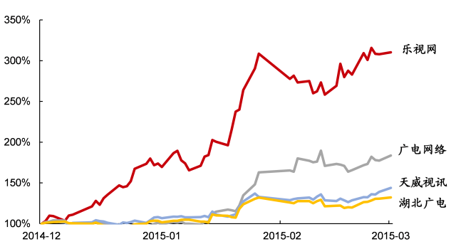 图 27: 乐视网及广电系上市公司2014年底来股价相对表现