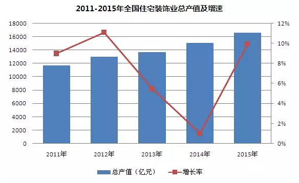 根据中国建筑装饰协会《2015年度中国建筑装饰行业发展报告》,2015年,全国建筑装饰行业完成工程总产值3.4万亿元,比2014年增加了2300亿元,增长幅度为7%。其中公共建筑装修装饰全年完成工程总产值1.74万亿元,比2014年增加了920亿元,增长幅度为5.6%;住宅装修装饰全年完成工程总量值1.66万亿元,比2014年增加了1500亿元,增长幅度为9.2%。