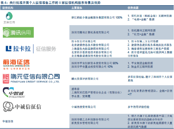 芝麻信用是阿里体系蚂蚁金服旗下子公司,信用信息主要来源于阿里巴巴的电商交易数据、蚂蚁金服的互联网金融数据,并与公安网等公共机构及商业合作伙伴建立数据合作。与传统征信信息不同,芝麻信用的信息涵盖了信用卡还款、网购、支付转账、理财、水电煤缴费、租房信息、社交关系等。芝麻信用依托阿里云的大数据分析技术,整合分析用户的个人信息,从用户的信用历史、行为偏好、履约能力、身份特质和人脉关系5个维度评价用户的还款意愿和还款能力,对不同的用户给出相应的芝麻分。目前,芝麻信用已经与北京银行签署战略合作协议,并已成为蚂蚁花呗等互联网金融领域快速授信、现金分期服务的信用依据,同时与合作伙伴在租车、租房、婚恋、签证等多个生活领域展开合作。