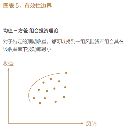 益。图表中的每一点都代表一种资产或一个投资组合;在风险既定的情况下,个人投资者会期望获得更高的收益,而在收益既定的情况下,个人投资者则会期望承担更低的风险。如果把图表4想象成一张地图,那么所有投资者都会希望朝西北方向移动,因为这意味着更高的收益和更低的风险。该图所展示的资产可能是单只股票、某个资产类别或其他任何可预估风险和收益的潜在投资。