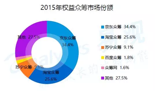 2015年权益类众筹市场中,凭借电商、金融业务净值较高的客群等资源,京东众筹市场份额保持第一,为34.4%,淘宝众筹、苏宁众筹紧随其后,二者在消费电子项目上与京东众筹张开争夺,纷纷加强了对电子产品项目的支持力度,未来市场间差距有望进一步缩小。值得注意的是,起步较早的点名时间等平台已然逐步失去市场地位。