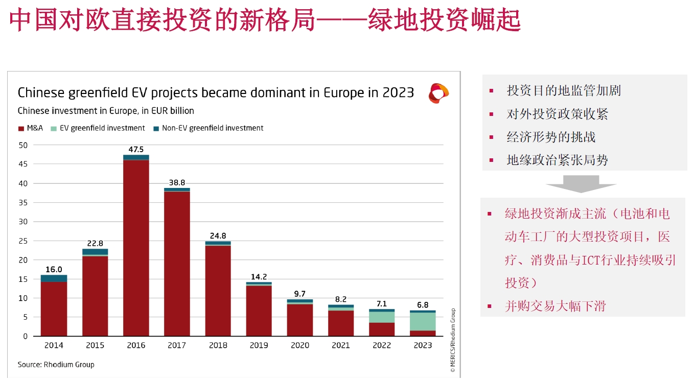 投资形式上,疫情后绿地投资比例大幅增长,未来有望成为主流。绿地投资增长原因包括并购监管加强、国内对外投资收紧、并购环境挑战以及地缘政治影响。企业通过绿地投资在欧洲设立工厂等,可分摊部分风险。其中,电动汽车及周边行业是绿地投资的主要领域,众多中国电池和电动车企业在欧洲投资设厂,匈牙利成为这波投资潮的最大获益者。除电动车行业外,医疗、消费品和信息通信技术也是中国企业在欧投资的主要领域。