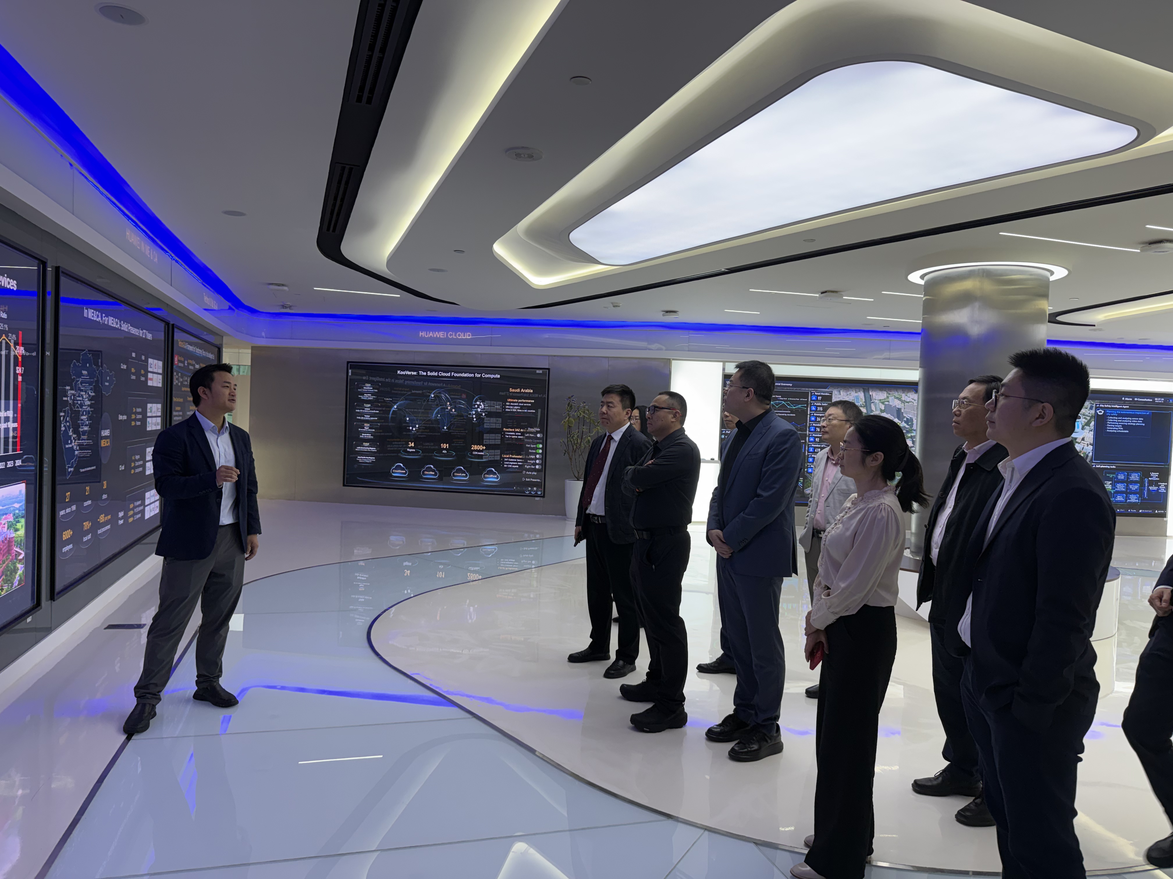 上午,考察团到访华为云,与华为中东团队围绕数字化转型、行业合作、市场拓展等议题深度座谈。华为作为全球ICT领域领军企业,中东业务覆盖政府、能源、金融、教育等多个核心领域,依托5G覆盖93%的海湾六国市场与刚上线的华为云服务(第一阶段2万台服务器,未来将持续扩容),成为中东数字化转型的核心推动者。