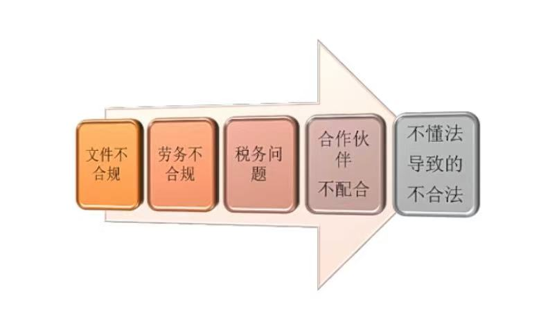 指出常见风险包括:文件不合规,因语言障碍忽视签字文件的严肃性。劳务不合规,持旅游免签入境工作,面临遣返风险。税务不合规,不经营也需按期申报,否则会产生罚款。合作伙伴纠纷,因文化、语言差异导致合作不畅。应对之道是强调“专业的事交给专业的人”,通过设立或外聘本地人事、会计、法务岗位,建立常态化的合规管理体系。